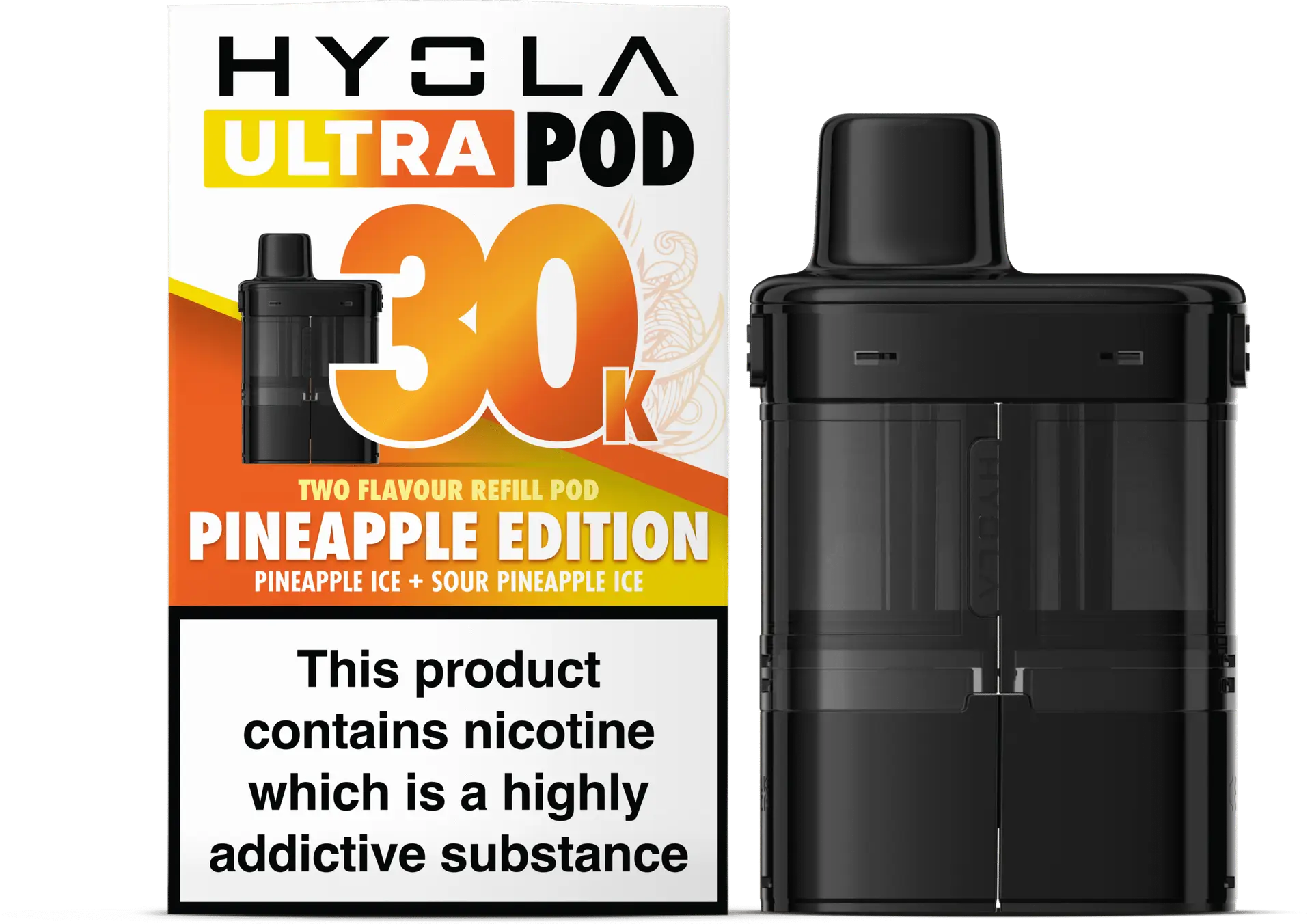 Hyola Pineapple Edition Ultra 30K refill packs are designed for the Hyola Ultra 30K big puff vape kit. Each refill pack contains two prefilled 1ml pods that house dual mesh coils, along with two 9ml refill containers. When assembled and paired with your device, they’ll provide up to 30000 puffs, along with a discreet amount of vapour for a familiar MTL (Mouth to Lung) inhale.